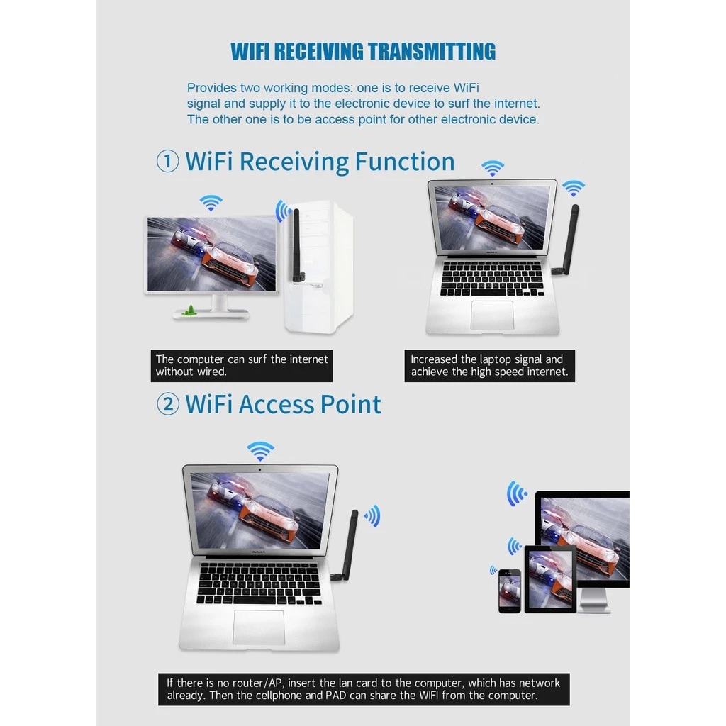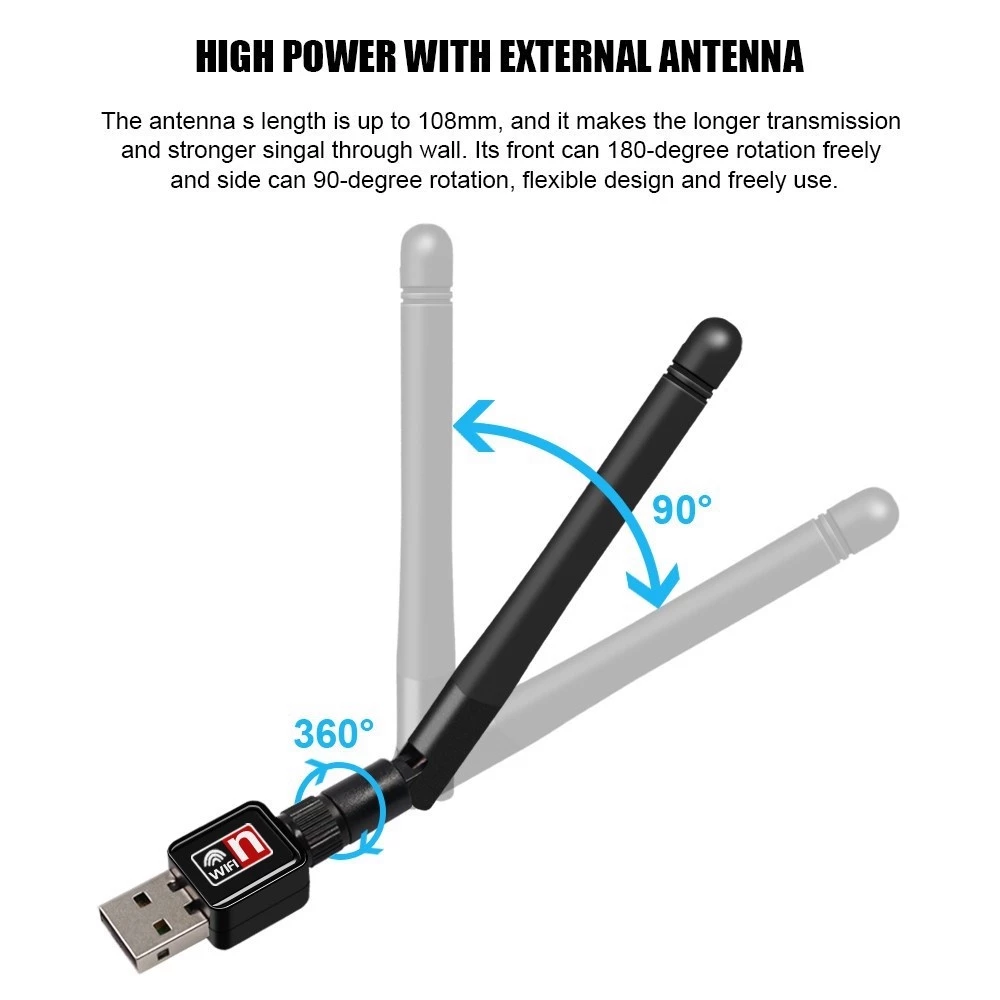 Features USB 2.0 Wireless Dongle Wireless N speed up to 150Mbps Support 64/128-bit WEP/WPA/WPA-PSK encryptions Support WinXp,7,8,10,MAC and Linux Complies with IEEE 802.11n, 802.11g and 802.11b Standard